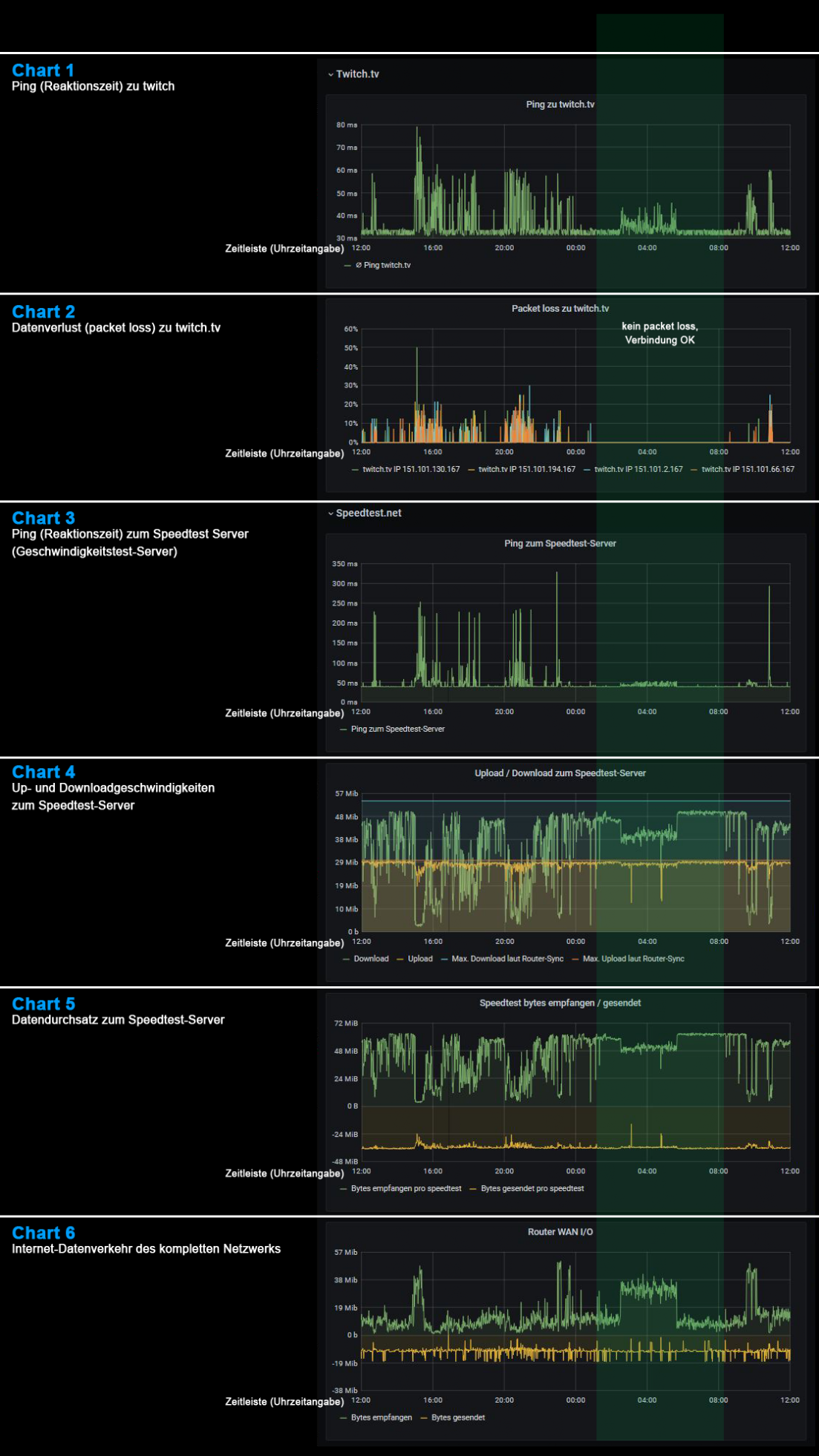 Der senkrechte grüne Streifen beschreibt den Sollzustand des Anschlusses, der, wie man sieht, nur zwischen ca. 1:00 Uhr nachts und 8:00 Uhr morgens erreicht wird (besonders deutlich in den Charts 2, kein packet-loss und 3, sehr gute Reaktionszeiten des Speedtest-Servers zu sehen).